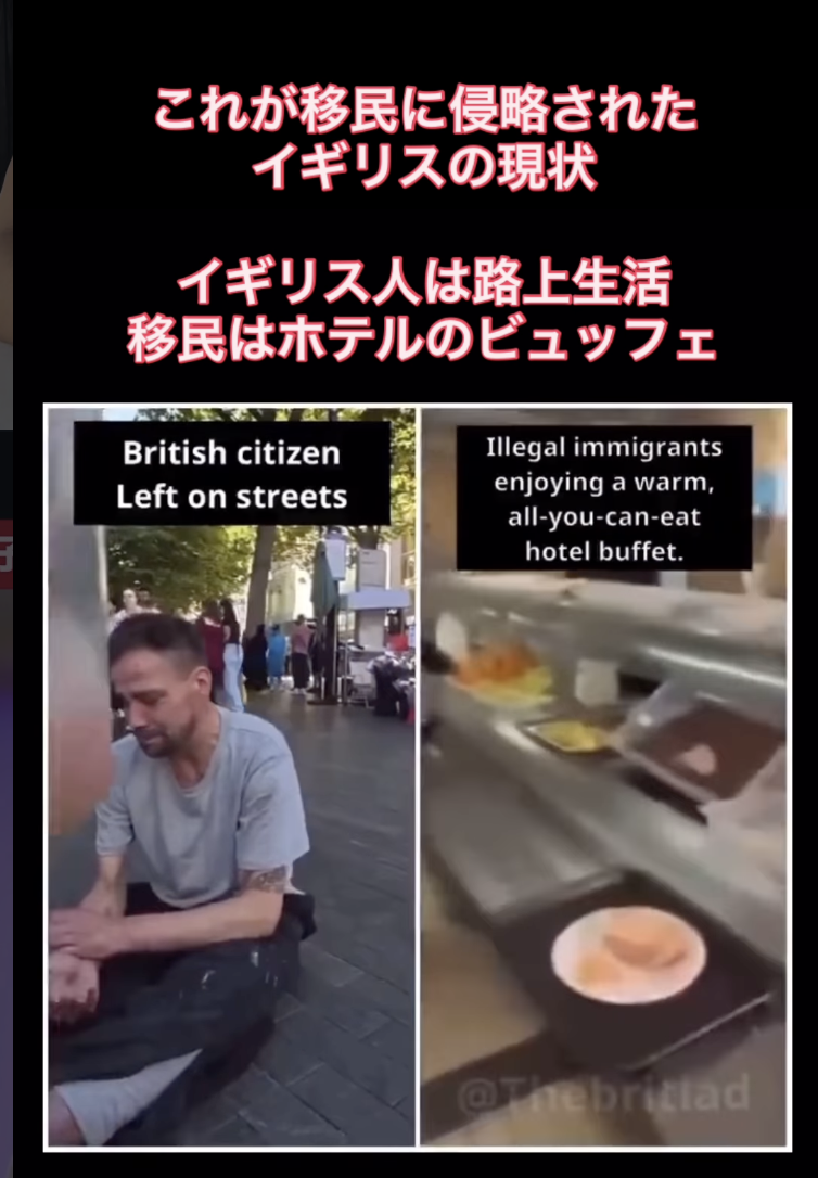 対して、移民はイギリス人の納めた税金で優雅にホテルのビュッフェを楽しんでいる
