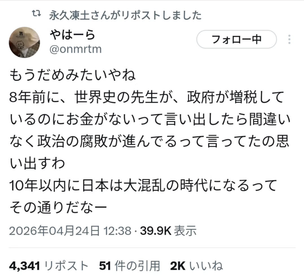 日々日本が壊されてるのに、まだアホみたいなインスタのリール動画や、バラエティ番組や、芸能人の不倫ニュースが大事か?